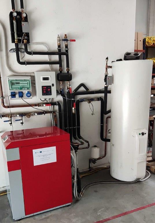 La instalación consta de dos pozos de captación geotérmica de 150 metros de profundidad cada uno de ellos, una bomba de calor CLAUSIUS modelo CLASSIC HC 5-25 PC, un depósito de ACS de 500 litros y varios fancoils para la climatización de las oficinas.