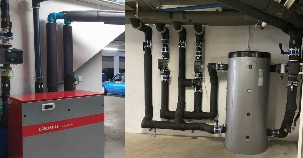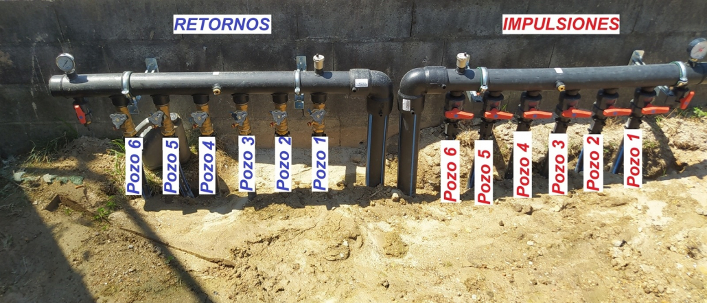 Instalación de bomba de calor geotérmica Clausius Strong Double HC 7-100 en un concesionario de automóviles en Ourense. Con 6 pozos de 150 metros de profundidad cada uno, cubrirá todas las demandas de calefacción y refrigeración, con un depósito de inercia de 1.000 litros.
