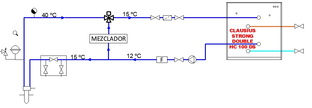 El desafío en esta ocasión ha sido adaptar la instalación a unas temperaturas de captación de 30-35 ºC, ya que nos encontramos en zona termal. La solución consistió en la colocación de una válvula mezcladora termostática en la entrada de la bomba de calor.
