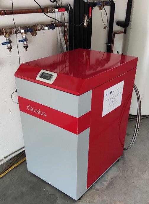 La instalación consta de dos pozos de captación geotérmica de 150 metros de profundidad cada uno de ellos, una bomba de calor CLAUSIUS modelo CLASSIC HC 5-25 PC, un depósito de ACS de 500 litros y varios fancoils para la climatización de las oficinas.